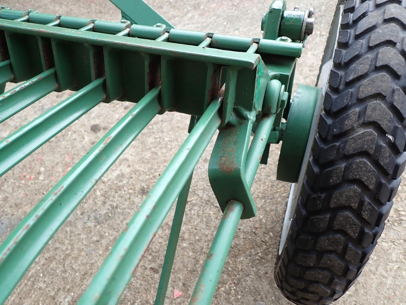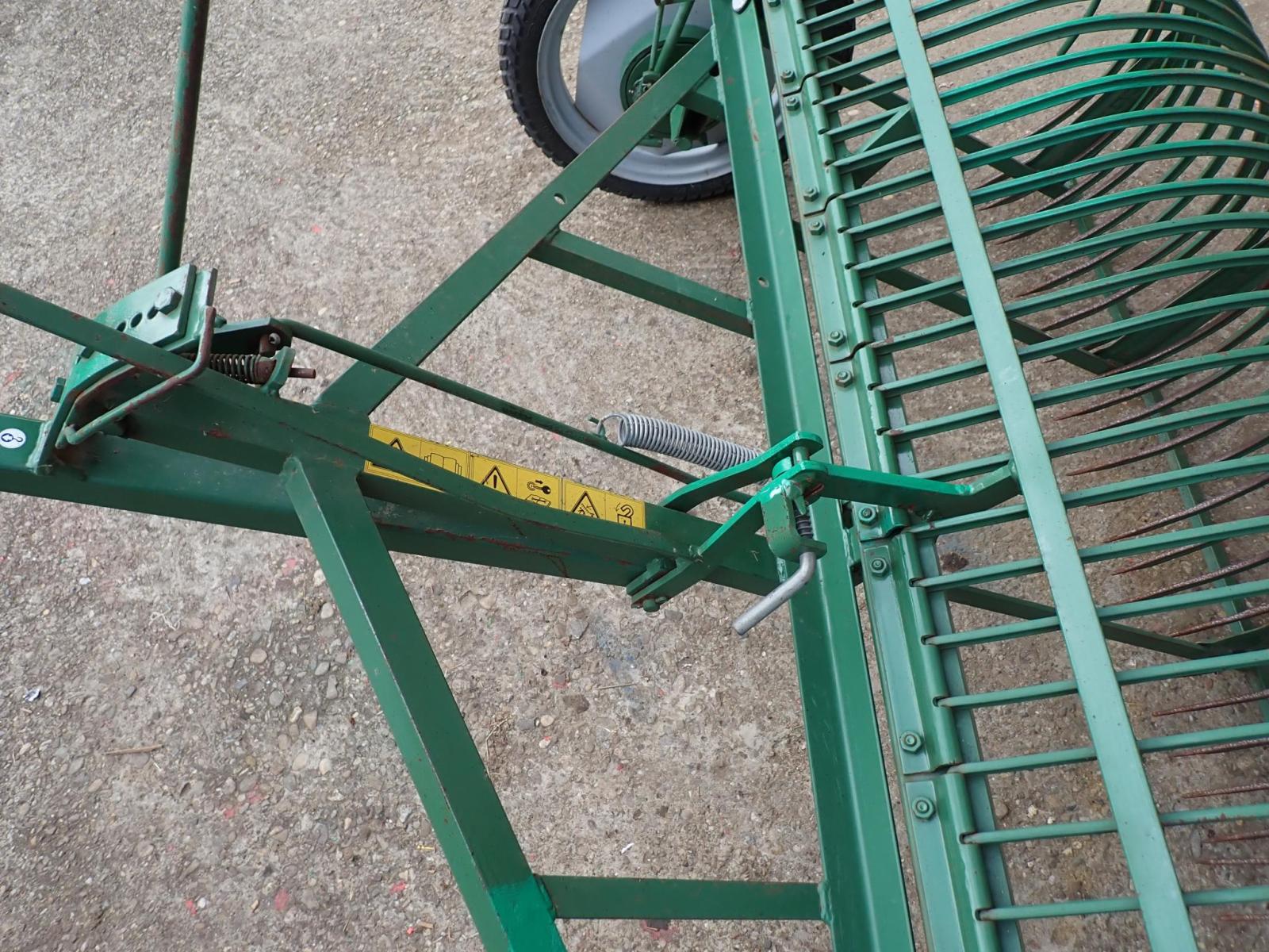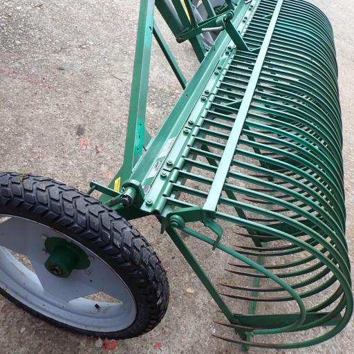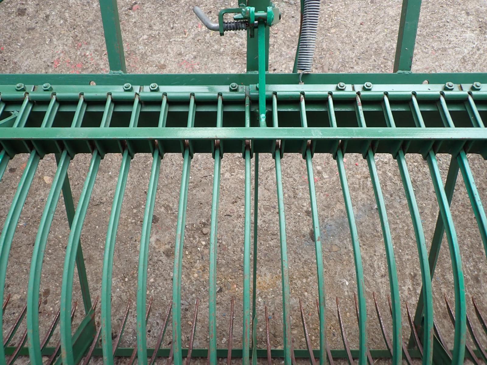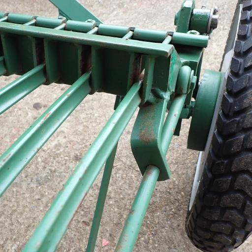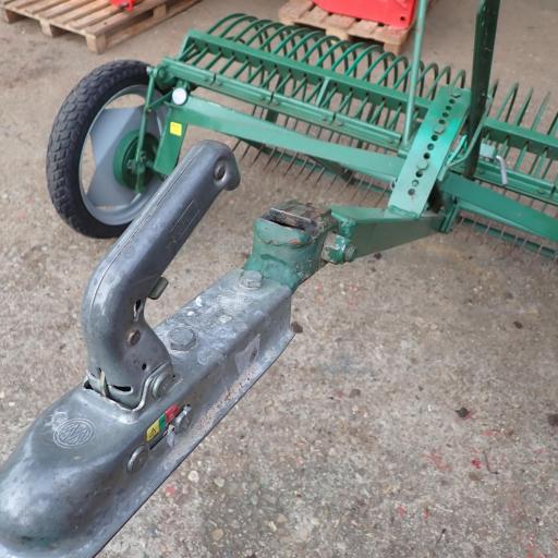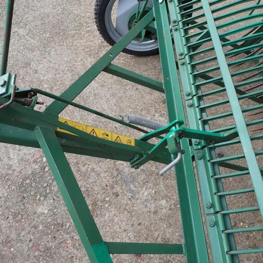 Gesamtbreite 2,40 Meter, Arbeitsbreite 2,20 Meter, gezogene Ausführung mit Bodenantrieb, 19 Zoll Räder, Zugdeichsel mit Kugelkupplung, Gewicht ca. 200 kg, mechanische Entleerung.