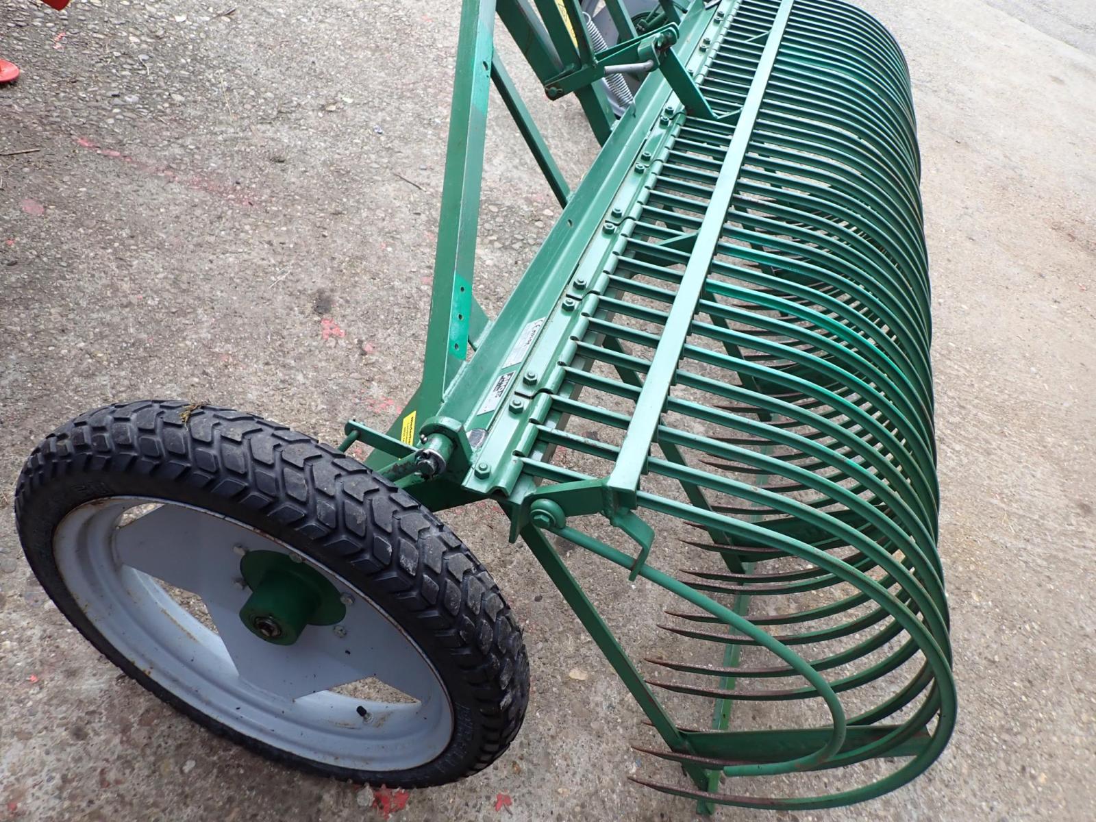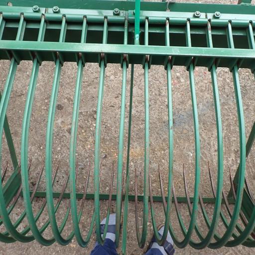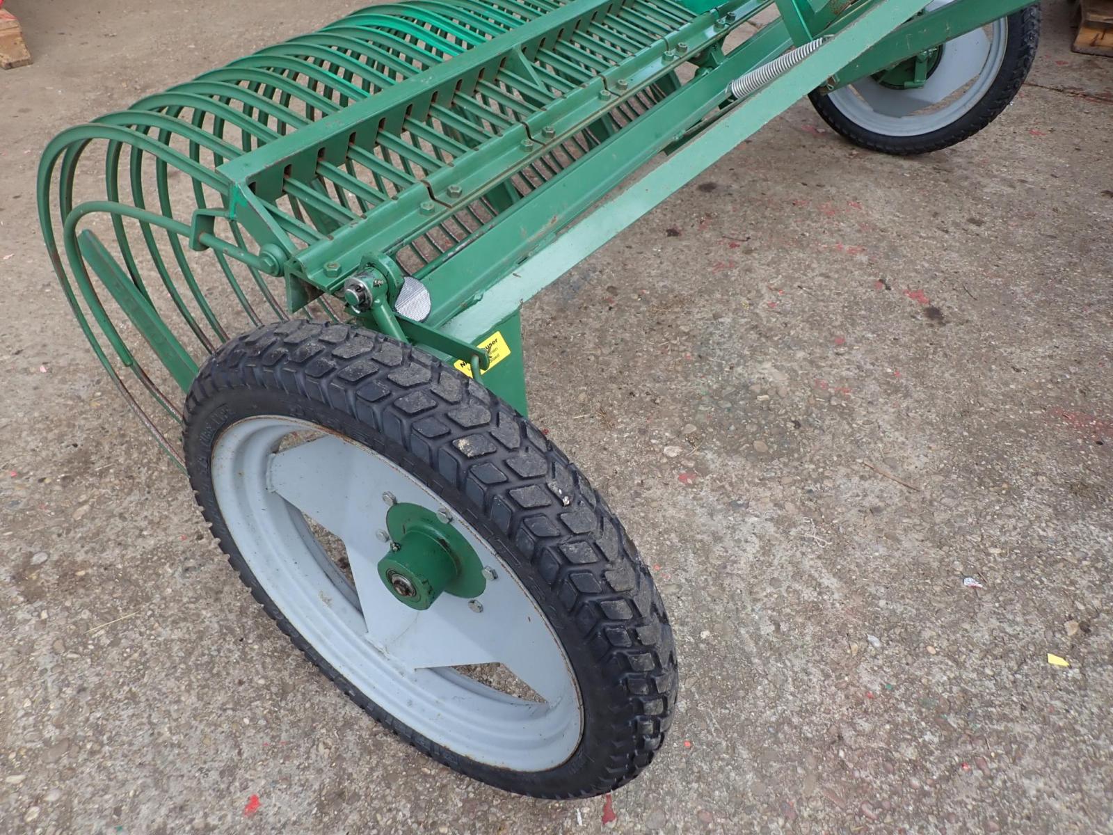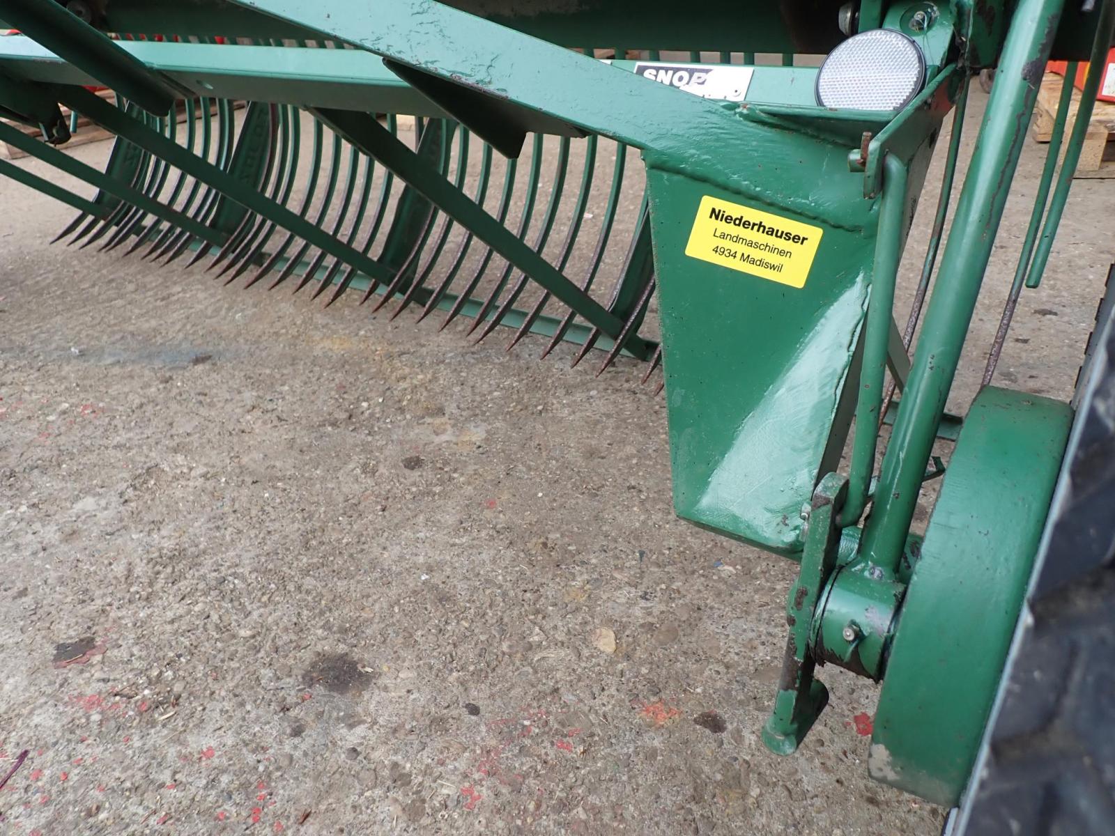 Gesamtbreite 2,40 Meter, Arbeitsbreite 2,20 Meter, gezogene Ausführung mit Bodenantrieb, 19 Zoll Räder, Zugdeichsel mit Kugelkupplung, Gewicht ca. 200 kg, mechanische Entleerung.