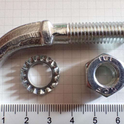 Komplett verzinkt und mit Mutter und Unterlagscheibe.