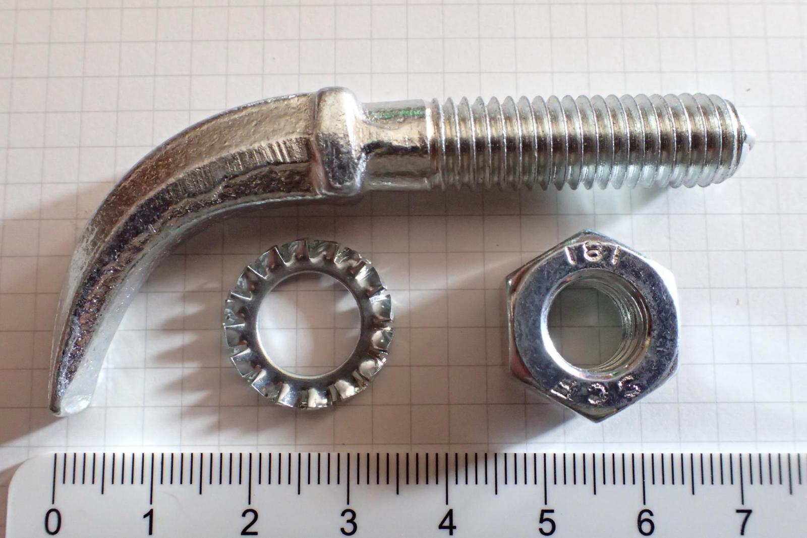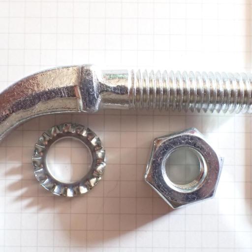 Komplett verzinkt und mit Mutter und Unterlagscheibe.