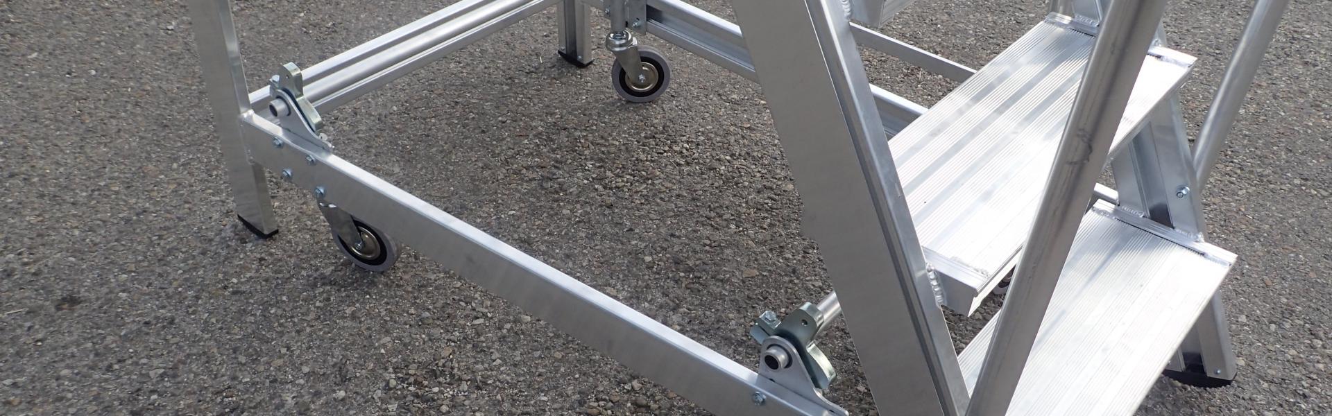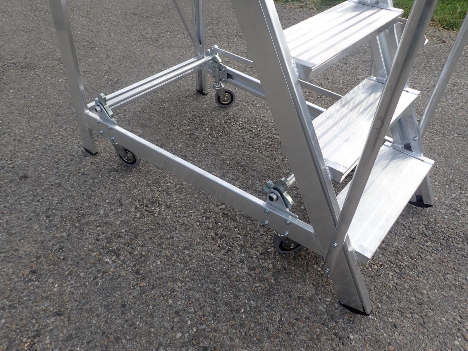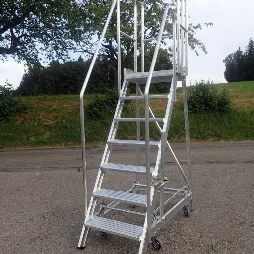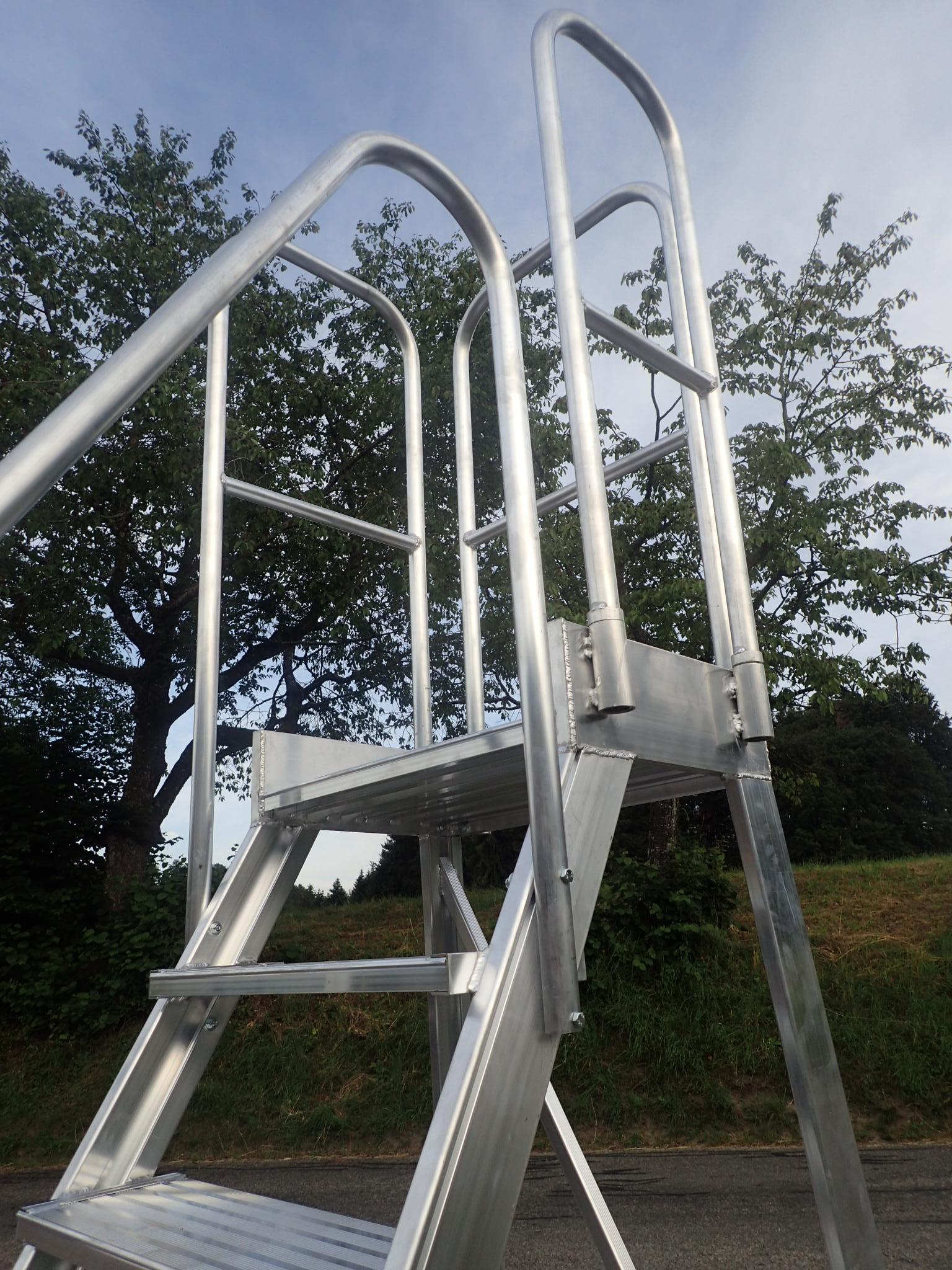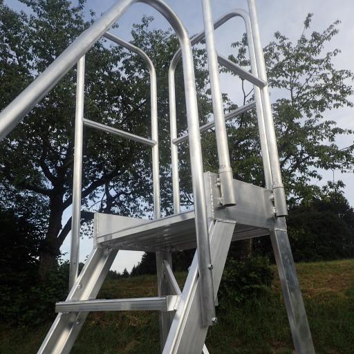 Die ganze Konstruktion ist aus Aluminium (roh) gefertigt. Die Neigung der Treppe ist 60 Grad. Die Podesttreppe weisst beidseitig Geländer auf und die Stufen sind mit einem längsgerillten Antirutschprofil versehen. Belastbarkeit ist bei 150 Kilogramm angegeben.