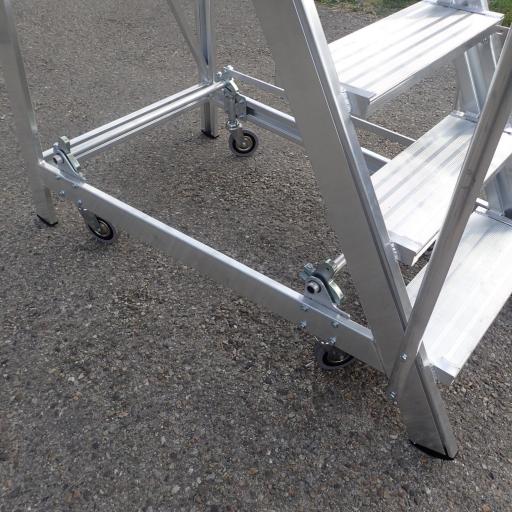 Die praktische Handhebelarretierung: Für Fahrberreitschaft Hebel gegen das Aufstiegsgeländer ziehen, beim Loslassen steht die Treppe automatisch auf den Gummifüssen.