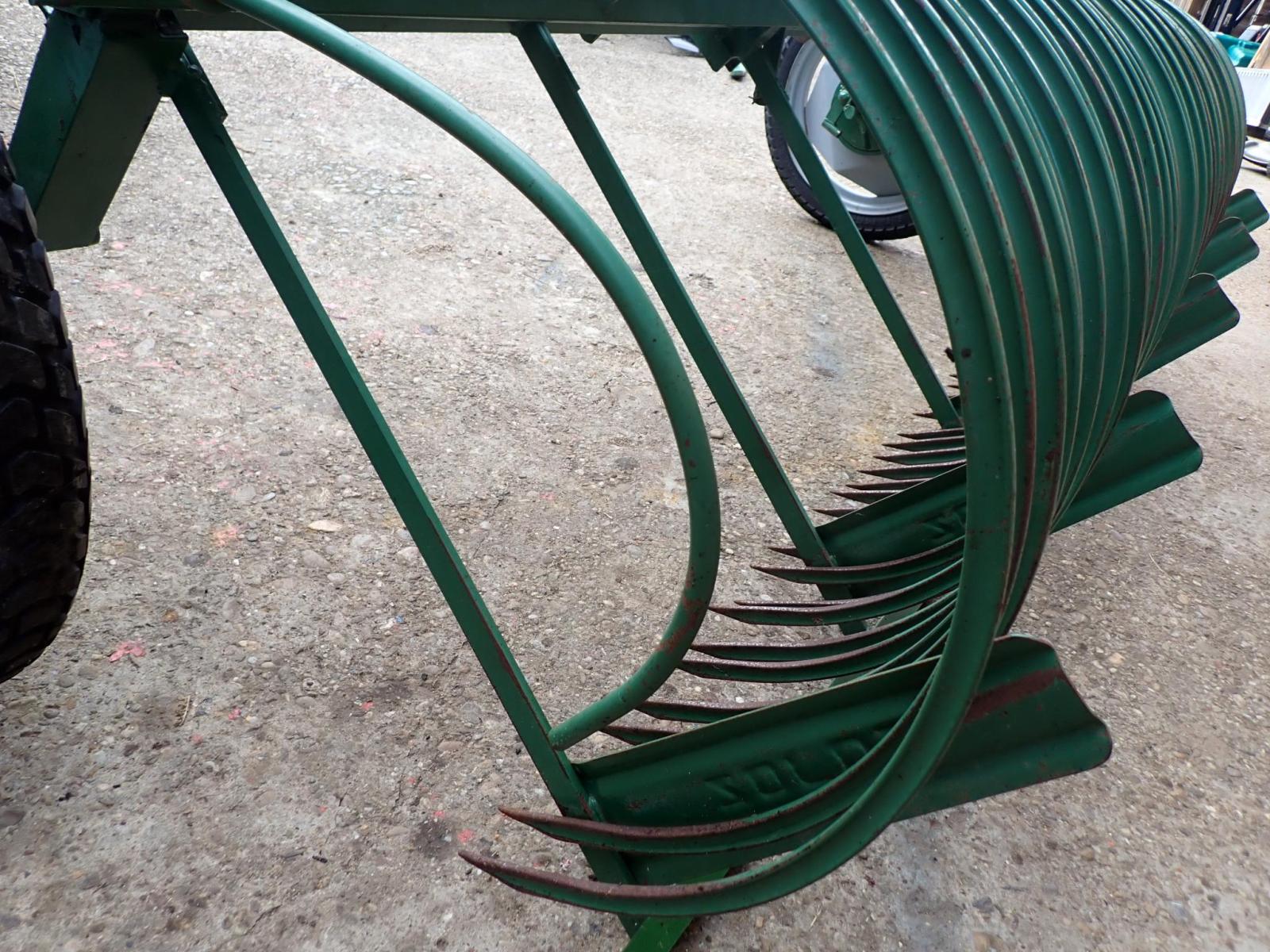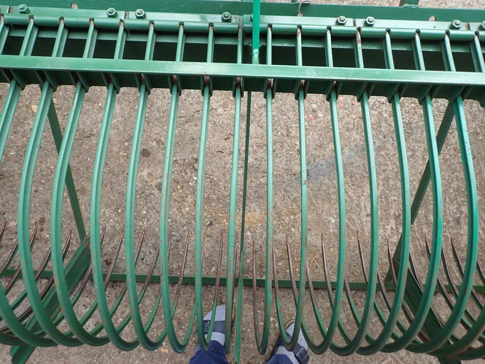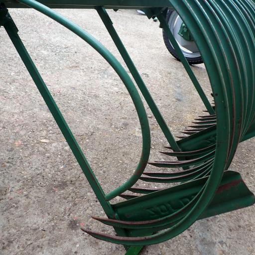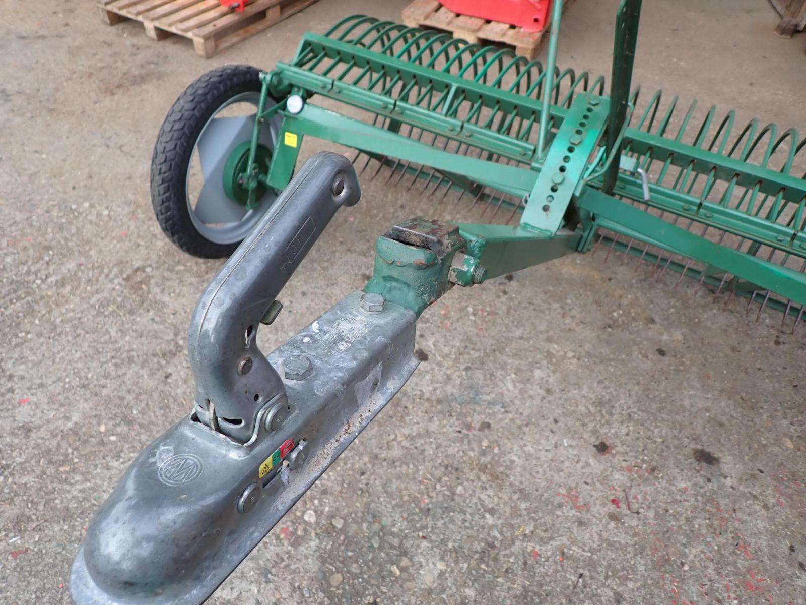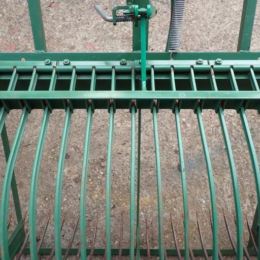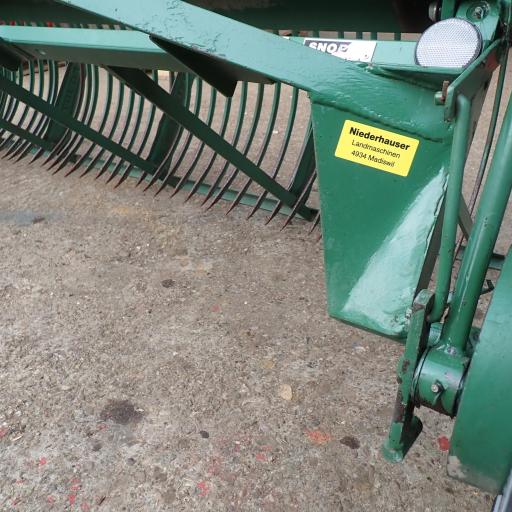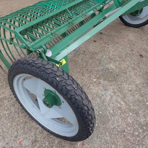 Gesamtbreite 2,40 Meter, Arbeitsbreite 2,20 Meter, gezogene Ausführung mit Bodenantrieb, 19 Zoll Räder, Zugdeichsel mit Kugelkupplung, Gewicht ca. 200 kg, mechanische Entleerung.
