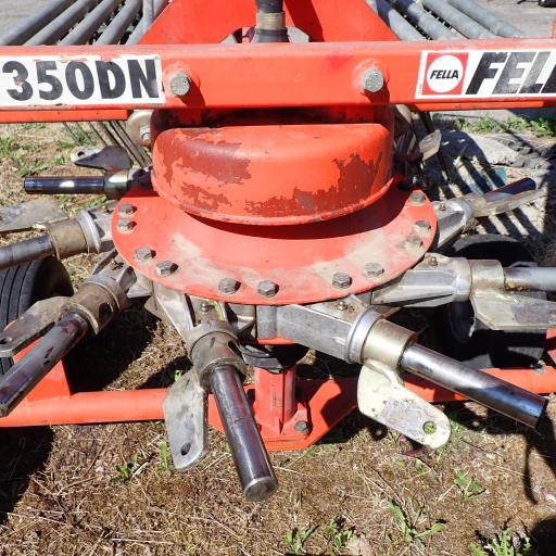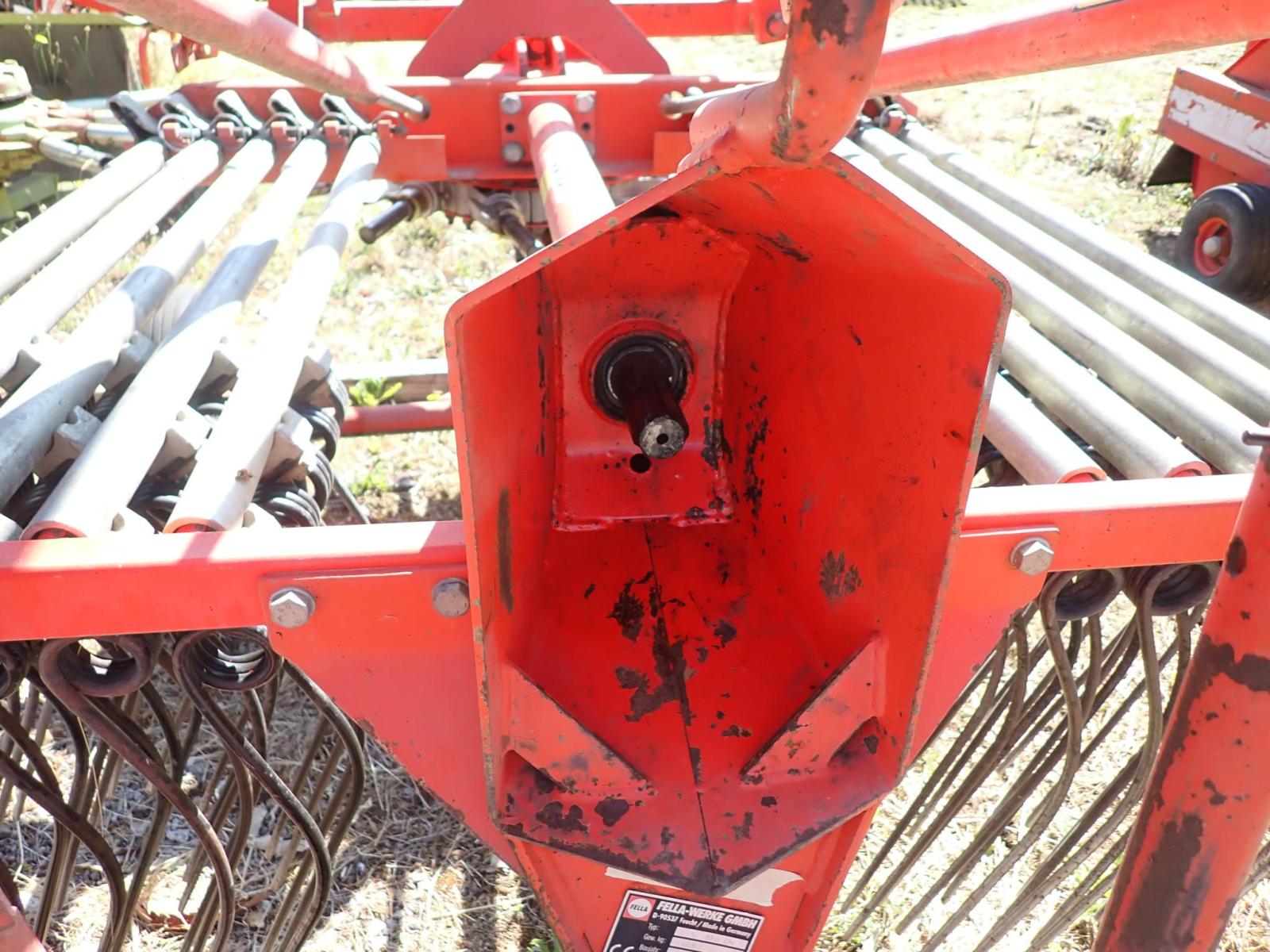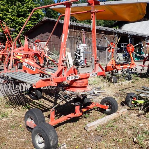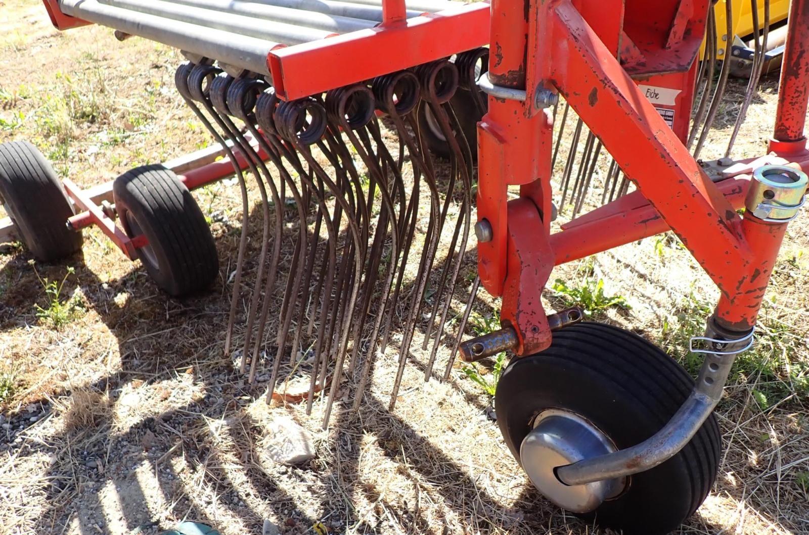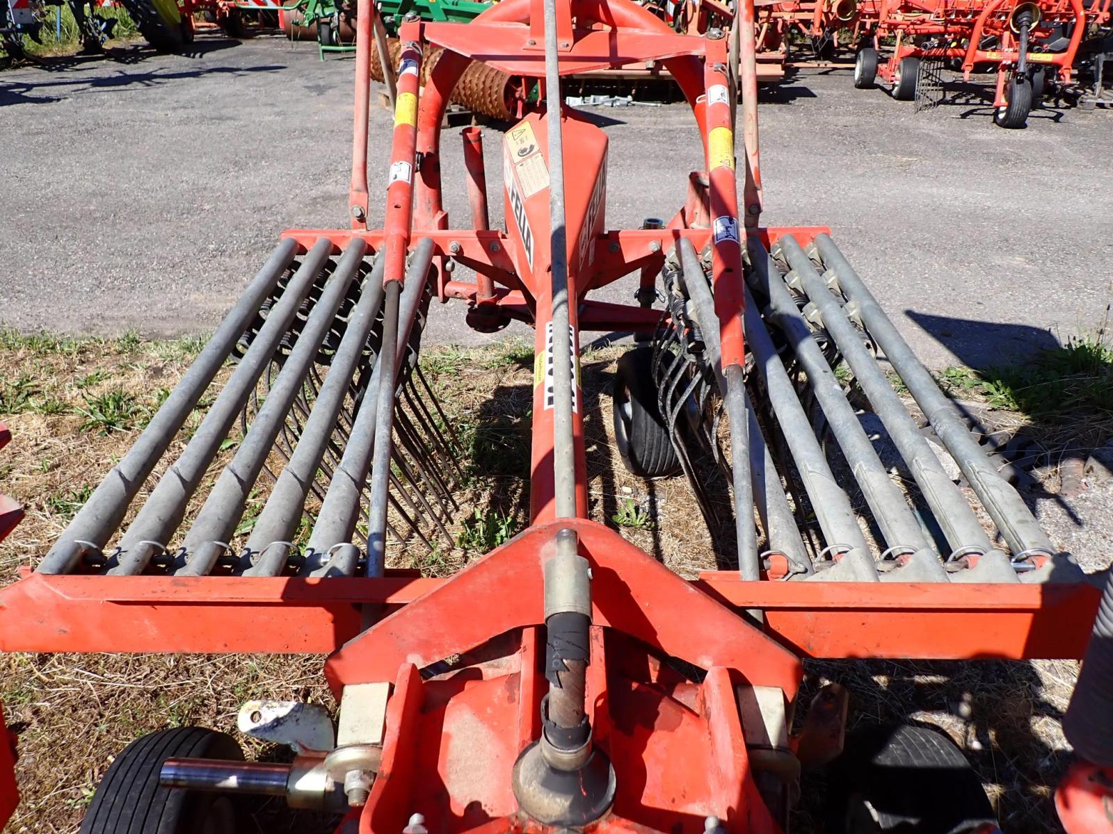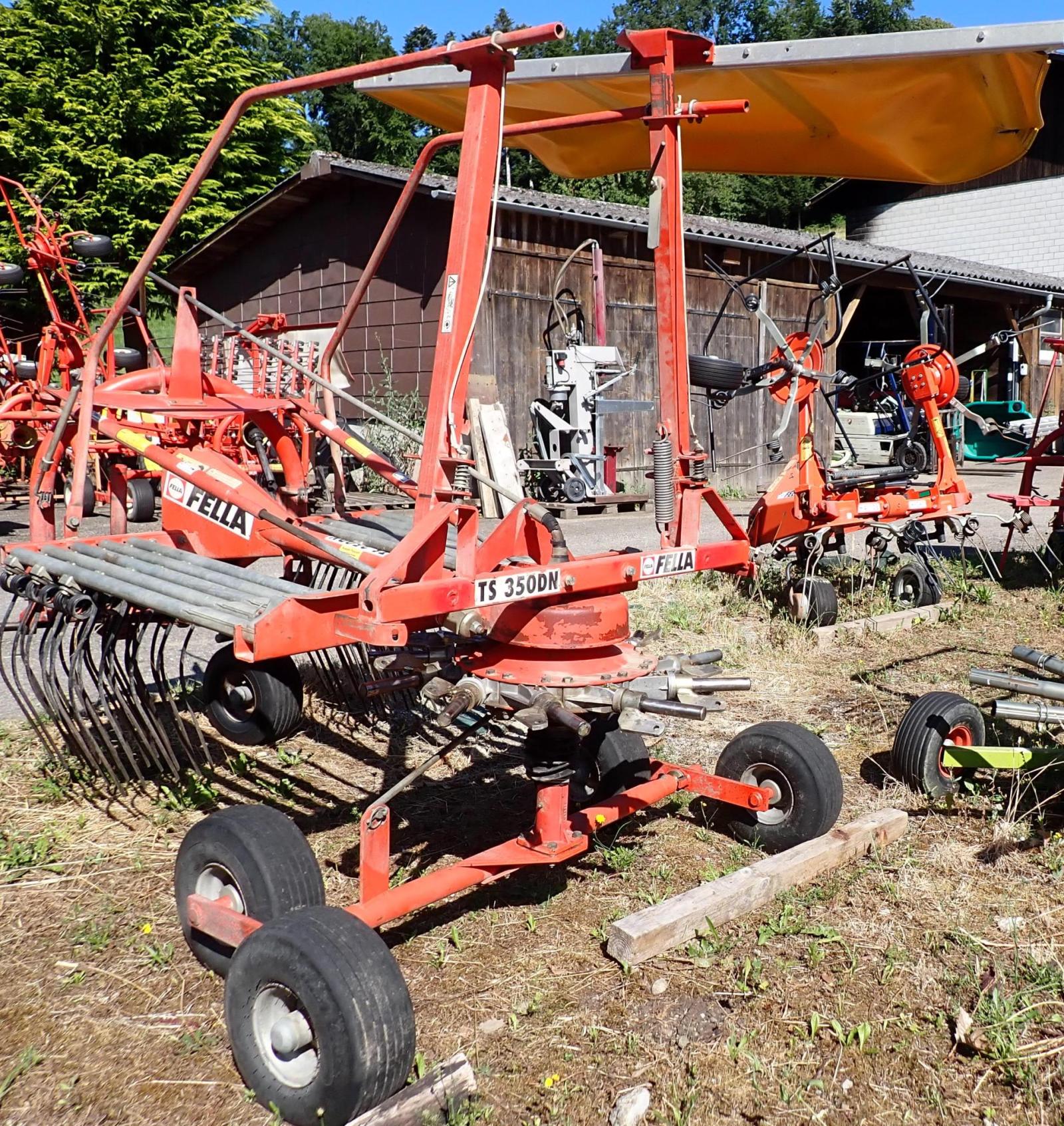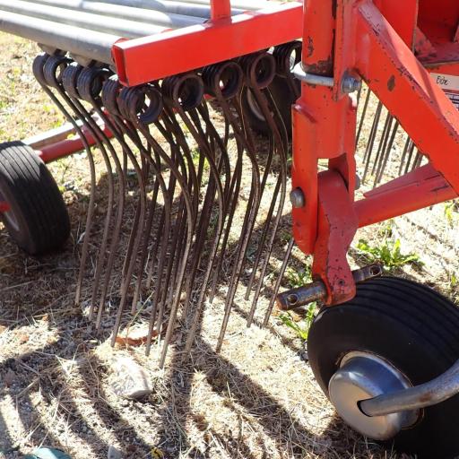 Arbeitsbreite 3,50 Meter, 10 Kreiselarme mit je 3 Paar Zinken, Gewicht ca. 400 kg, Ballonbereifungen 15 X 6.00-6, Tandemachsen, Stützrad mit Kettenoberlenker, verstellbare Kurvenbahn, Gelenkwelle, Kurbel für Höhenverstellung vom Traktorsitz aus, Dreipunkt-Schwenkbock Kat. I + II mit Stabilisatoren-