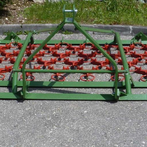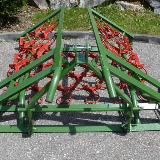 Wiesenegge mit 3 Meter Arbeitsbreite, 4-Reihen Gusselemente, Gewicht 260 kg. Mechanisch seitlich aufklappbar. Dreipunktbock in Grundausrüstung Kat. 1 (Kat. 2 möglich). Passend an Vierradmäher und Traktoren.