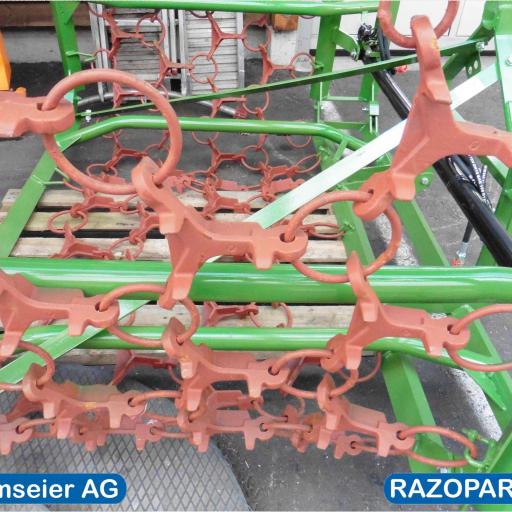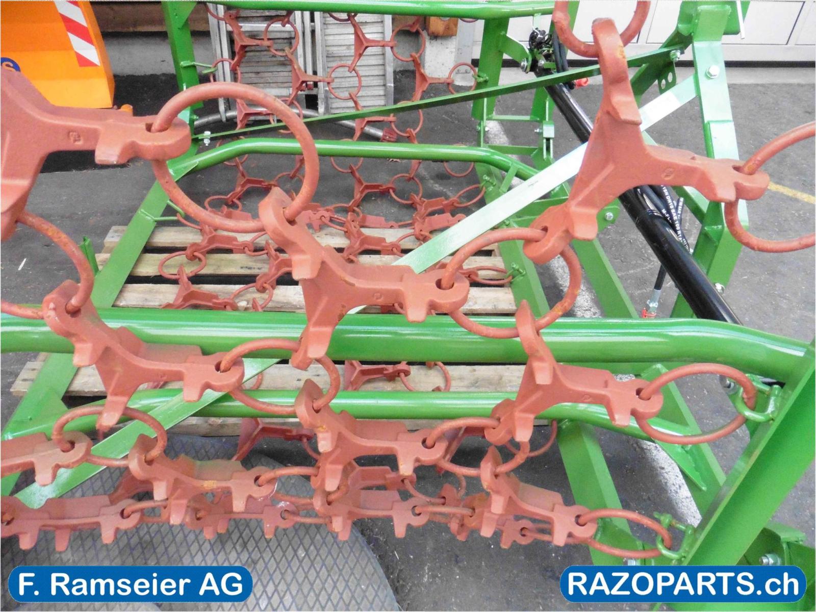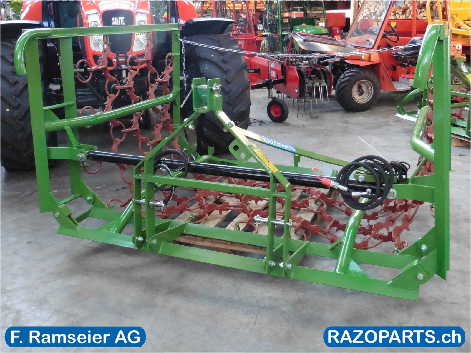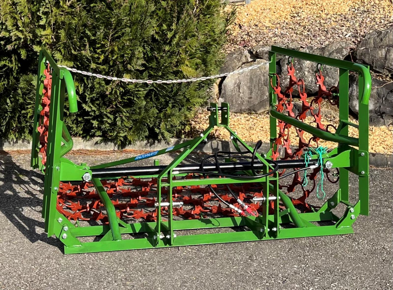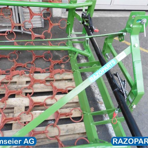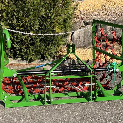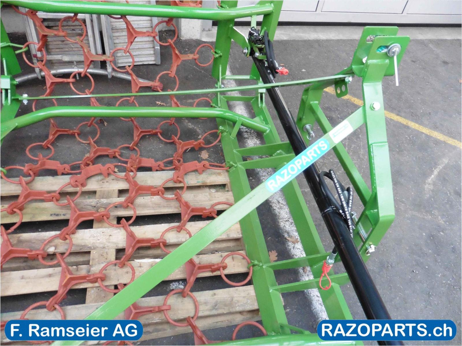 Wiesenegge mit 4 Meter Arbeitsbreite. Hydraulische seitliche Hochstellung mit einem zentralen Hubzylinder. Am Fahrzeug ist 1 DW-Ventil nötig. 4-Reihen Gusselemente, schwere Ausführung. Gewicht der Wiesenegge 350 kg. Dreipunktbock in Grundausrüstung Kat. 1. Passend an grosse Vierradmäher und Traktoren.
