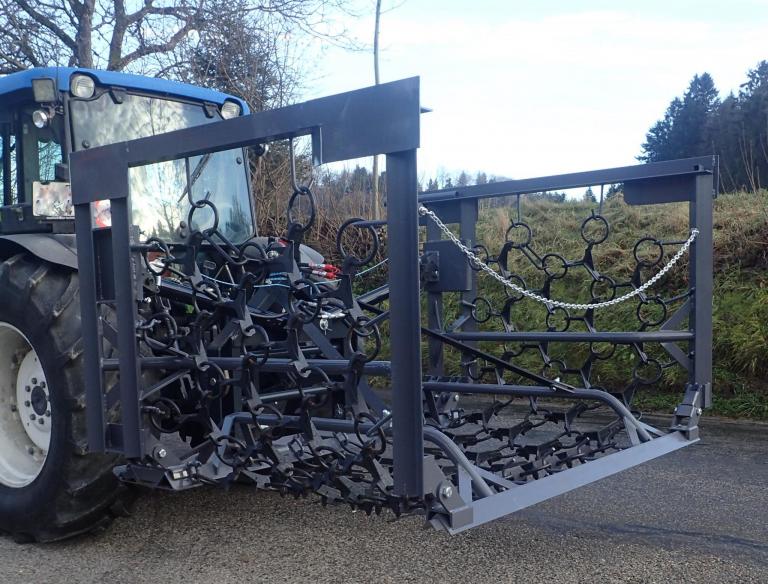 Die Seitenteile sind für den Strassentransport einklappbar (ausser bei der 2 Meter Wiesenegge). Die Gusselemente des Netzes können beidseitig verwendet werden. Geschlossener Rahmen aus Winkeleisen. Ausführung mit 3-Ringreihen. Für Dreipunktanbau.