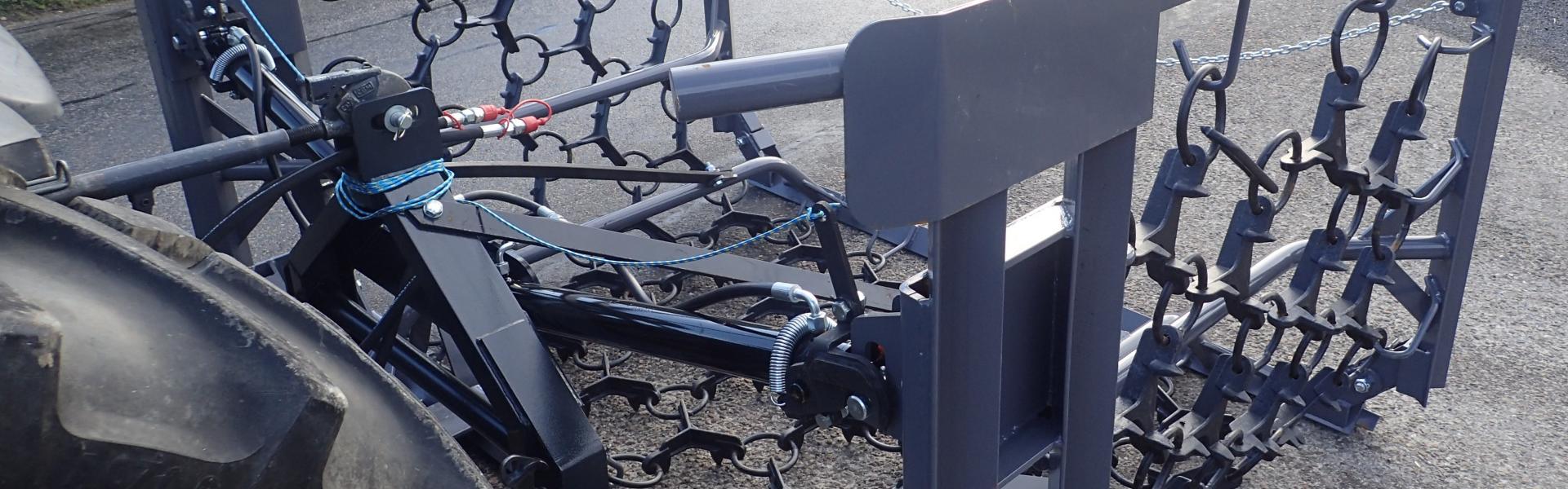 Rahmen aus Winkeleisen, frei nachlaufende Heckplanierschiene. Ausführung mit 4 Ringreihen. Für Dreipunktanbau Kategorie II, mit zwei Hydraulikzylindern.